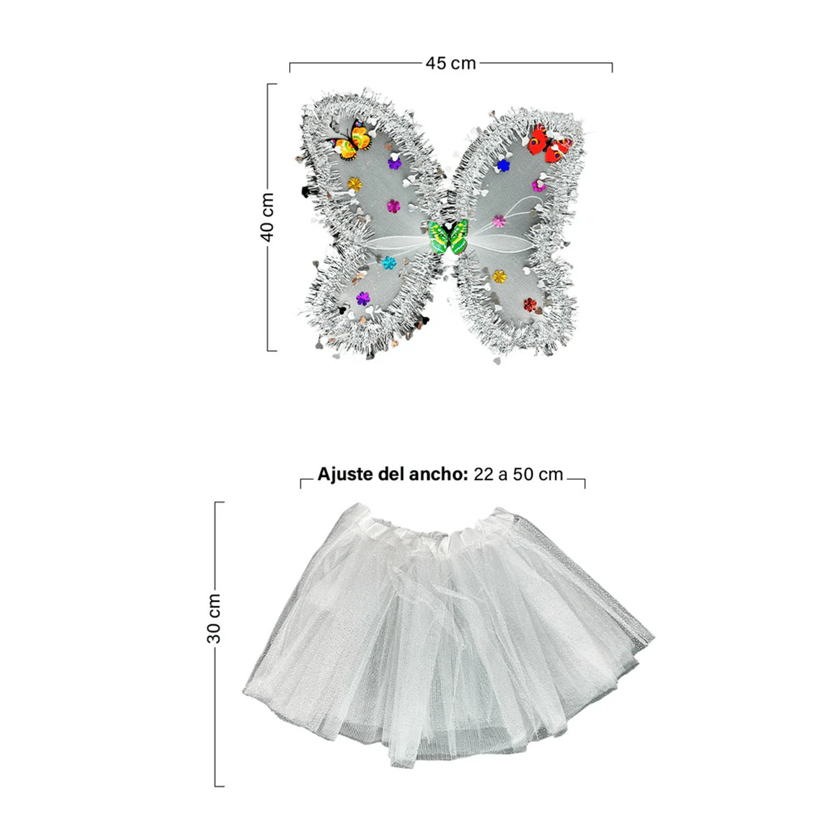 Tallas única (Adaptable a razas medianas y grandes): Tutu: 22 – 50 x 30 cm / Alas: 45 x 40 cm.